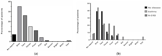 Figure 3. Number of previous operations. The number of previous operations experienced by study patients is displayed on the x-axis. (a) The percentage of patients in the entire cohort; (b) and of the different groups of no concomitant disease (n = 18, dark grey), asthma (n = 25, light grey), and N-ERD (n = 32, black) is displayed on the y-axis.