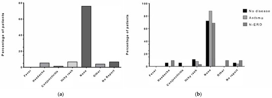 More than two-thirds of patients in the entire cohort (n = 57, 76%) did not report any side effects from Dupilumab injections. The most commonly reported side effect was an itchy rash in 7% of patients, followed by headaches in 4% of patients (Figure 2a). There were no obvious deviations from this distribution of side-effects in the abovementioned subgroups (Figure 2b).