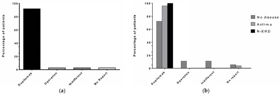 Patients with concomitant asthma (n = 25, 33.3% of the entire cohort) showed a 98% preference for Dupilumab, and only one patient who made no report (n = 1, 4%) was found in that group. Patients with concomitant N-ERD reported a 100% preference for Dupilumab. The smallest subgroup (n = 18, 24% of the entire cohort) were patients without concomitant disease, and the preference for Dupilumab in this subgroup was 72.2%. All patients who preferred the operation (n = 2, 11.1%) and all patients who had no preference (n = 2, 11.1%), as well as one patient who made no report (n = 1, 5.6%), were found in that group. Results for the subgroups are shown in Figure 3b.