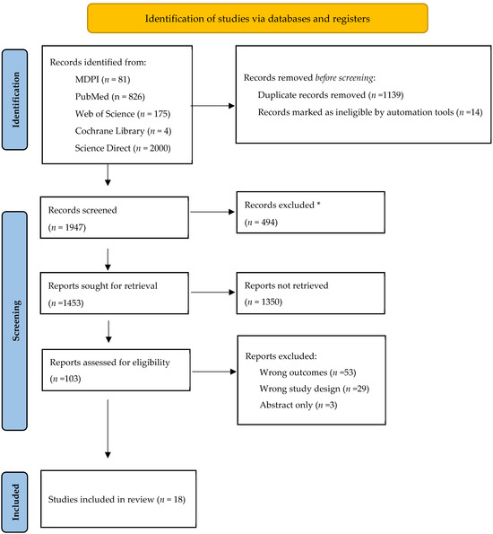 - Page, M.J.; McKenzie, J.E.; Bossuyt, P.M.; Boutron, I.; Hoffmann, T.C.; Mulrow, C.D.; Li, T.; Loder, E.W.; Mayo-Wilson, E.; McDonald, S.; et al. The PRISMA 2020 statement: An updated guideline for reporting systematic reviews. BMJ 2021, 372, n71. [Google Scholar] [CrossRef] [PubMed]