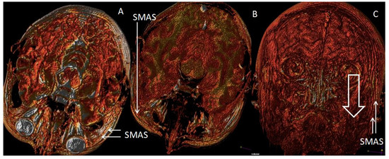 Representation of the antigravitational fixation regions of the SMAS and the retaining ligaments involved in the aging face: (A) Transversal 3D reconstruction on which the transverse plane of the SMAS is highlighted, corresponding to the zygomatic and temporal ligaments, from the infraorbital region to the zygoma; (B) Transverse 3D reconstruction highlighting the existence of the topographic plane of the SMAS insertion at the level of the nasolabial fold; (C) Coronal 3D reconstruction highlighting the topographic plane of the SMAS from the tragus to the gonion—the downward arrow indicates the direction of movement of the SMAS in this region in the aging face (personal collection).