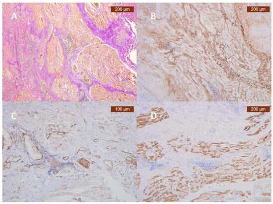 The main role of the SMAS components is to achieve the antigravity support of the face, what we called “sustentaculum facies” [31]. The functional capabilities of this facial lift apparatus depend overwhelmingly on the integrity and regional characteristics of its vascular microperfusion. There is a direct correlation between the quality and quantity of collagen and myosin fibers in the SMAS network and the homeostasis of the blood circulation itself. Recent molecular studies demonstrate more than that, specifically the fact that SMAS has its own vascular plexiform network. Collagen type III showed diffuse fibrillar staining throughout the stroma, reproducing their characteristic fine, irregular fiber distribution and thick network. The amount and intensity were varied from moderate to strong. Immunohistochemical analysis of ICAM-2 revealed that the antibody primarily was expressed with moderate and strong intensity on the epithelium that covers blood vessels. MyH2 was present in muscle fibers in stroma. The expression in cytoplasm of spindle-striated muscular cells were more moderate to strong [32] (Figure 3).