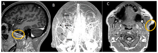 3T MRA imaging blood sources of masseteric regions. (A) SMAS masseteric branches from the internal maxilary artery; (B) Masseteric main arterial anasthomoses; (C) The auricular artery’s parotid branch.