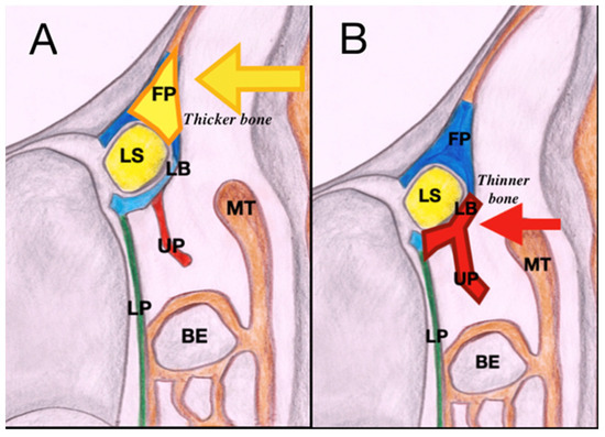 (A) Anterior EE-DCR is performed through a wide osteotomy and drilling of the frontal process of the maxilla. (B) Posterior approach, after uncinectomy, encompasses the drilling of a thinner area at the level of the lacrimal bone. In this way, preparing mucosal flaps is not necessary since the sac is approached at its thinnest walls, without leaving any area of bone exposed. (Abbreviations: LS, lacrimal sac; LB, lacrimal bone; FP, frontal process of the maxilla; MT, middle turbinate; LP, lamina papyracea, UP, uncinate process; BE, bulla ethmoidalis).