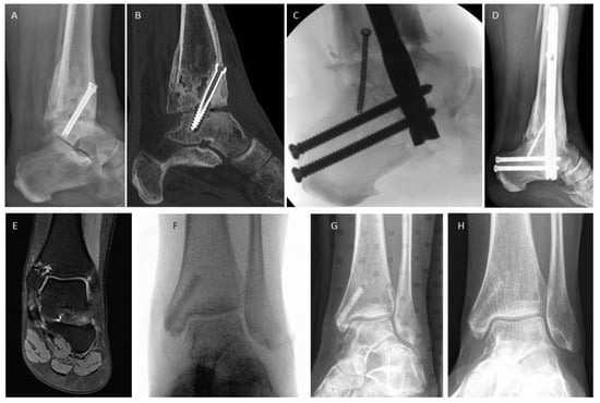 - Krause, F.; Younger, A.S.; Baumhauer, J.F.; Daniels, T.R.; Glazebrook, M.; Evangelista, P.T.; Pinzur, M.S.; Thevendran, G.; Donahue, R.M.; DiGiovanni, C.W. Clinical Outcomes of Nonunions of Hindfoot and Ankle Fusions. J. Bone Jt. Surg. Am. 2016, 98, 2006–2016. [Google Scholar] [CrossRef]