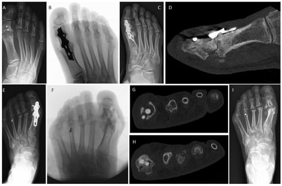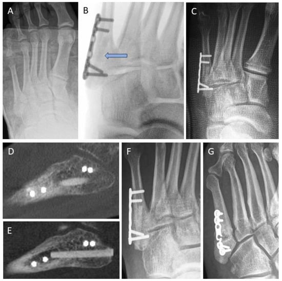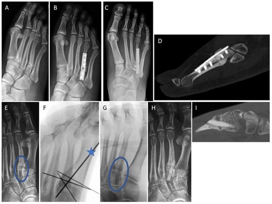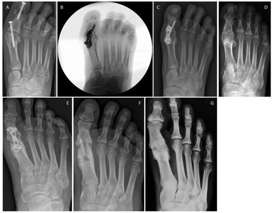 - Takács, I.M.; Swierstra, B.A. Pseudoarthrosis repair after failed metatarsophalangeal 1 arthrodesis. Acta Orthop. 2011, 82, 114–115. [Google Scholar] [CrossRef] [PubMed]