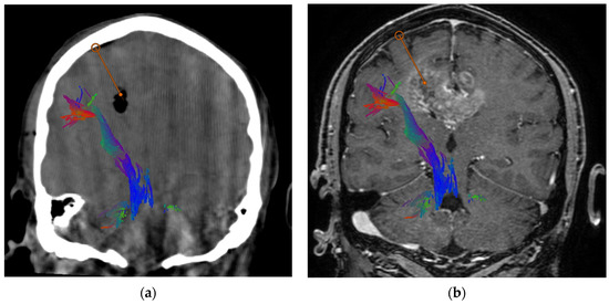 The safety of the procedure is also improved by integrating pre-operative tractography in the planning of trajectory, thus reducing the theoretical risk of damage to relevant fiber bundles like the corticospinal tract (Figure 2). A larger patient sample should be used to corroborate our impression that the recognition of the cortico-spinal tract (CST) may have a clinical impact in reducing the risk of motor impairment. A small hemorrhage may provoke a motor impairment, or it may be pauci-symptomatic; this may be a consequence of the distance of the needle trajectory from CST. The inclusion of tractography in the pre-surgical imaging protocol and the integration of the position of the CST among the various factors to be considered in the planning could be, in our opinion, a valuable help in some cases. The described case series is too small, and we have not encountered any hemorrhage, so we cannot test this hypothesis in the present study.