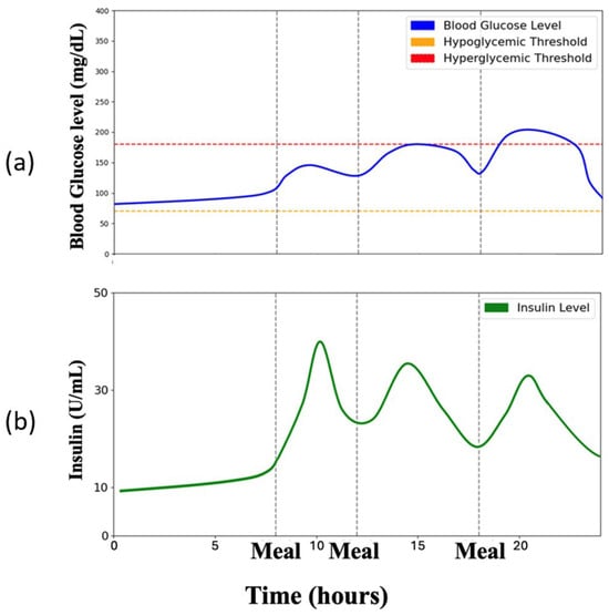 - Outcomes: The digital twin enables personalized, data-driven insulin optimization, enhancing blood glucose control while reducing risks like hyperglycemia and hypoglycemia. Our method’s efficacy was assessed based on three parameters: blood glucose concentration, the likelihood of experiencing hypoglycemia or hyperglycemia, and the duration within the euglycemic zone (70–180 mg/dL), which is considered the ideal blood glucose interval to reduce diabetes-related complications. The outcomes indicated that our approach effectively maintained blood glucose within the desired range, reducing the risk of extreme fluctuations and increasing the time spent in the euglycemic zone. This demonstrates the power of digital twins to drive individualized care. Figure 2 demonstrates the application of Soft Actor–Critic (SAC)-based reinforcement learning (RL) on a patient’s digital twin to enhance glucose level regulation, aiming to minimize the percentage of time that blood glucose level is in the risk range and stabilize overall glucose levels.