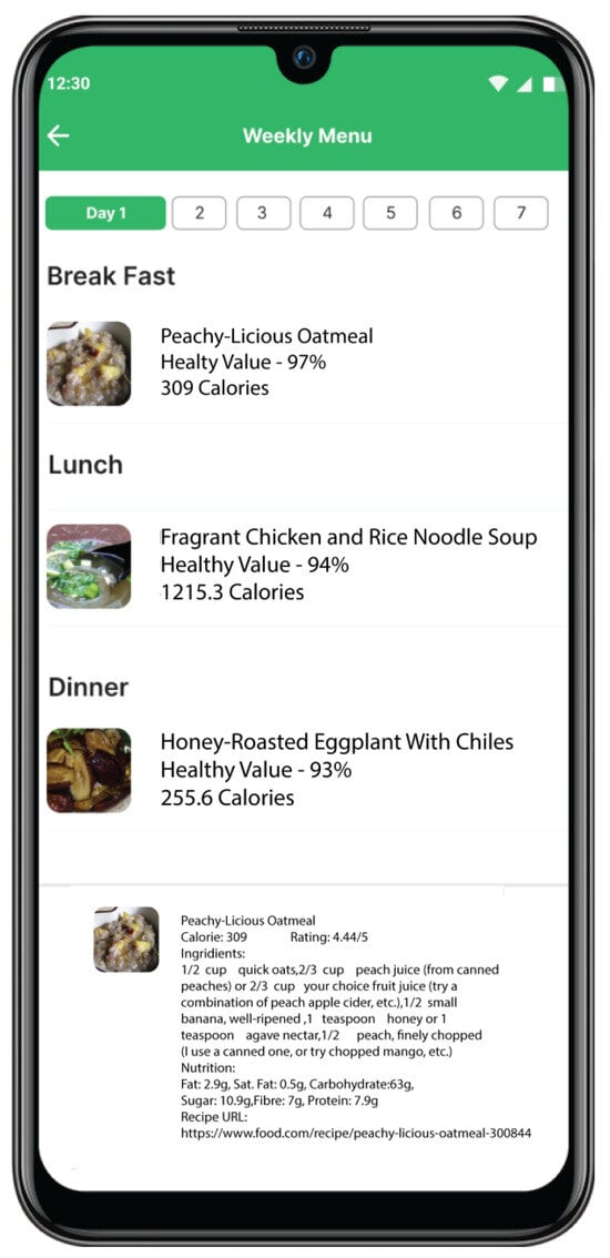 - Outcomes: Our digital twin extends its capabilities beyond mere data provision; it delivers practical, personalized dietary recommendations that cater to each individual’s unique needs. This enables patients to make well-informed food selections that help regulate their blood sugar levels and enhance their overall health. As demonstrated in Figure 7, we have developed a mobile application that leverages our digital twin to offer individualized meal suggestions for patients with diabetes.