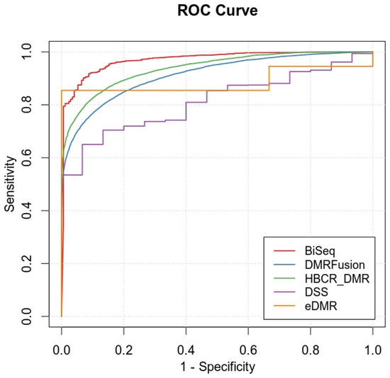 The results showed that Methylkit/eDMR, BiSeq, DSS, DMRFusion, and HBCR_DMR identified 1249, 6484, 4718, 6271, and 7111 significant DMRs, respectively. Table 2 indicates that the HBCR_DMR method has more TP DMRs than the other methods. Considering sensitivity and specificity, HBCR_DMR and BiSeq outperform the other methods. The specificity values for Methylkit/eDMR and DSS are both 0.99, while their sensitivity values are relatively poor. The accuracy measures for BiSeq and HBCR_DMR are 0.85 and 0.82, respectively, while DSS, DMRFusion, and Methylkit/eDMR have accuracy values of 0.78, 0.67, and 0.64, respectively. Thus, the highest accuracy values are achieved by BiSeq and HBCR_DMR. In terms of the AUC and F1 score as performance metrics, HBCR_DMR achieves an AUC of 0.94 and an F1 score of 0.76, which is second only to BiSeq, which has an AUC of 0.97 and an F1 score of 0.78.