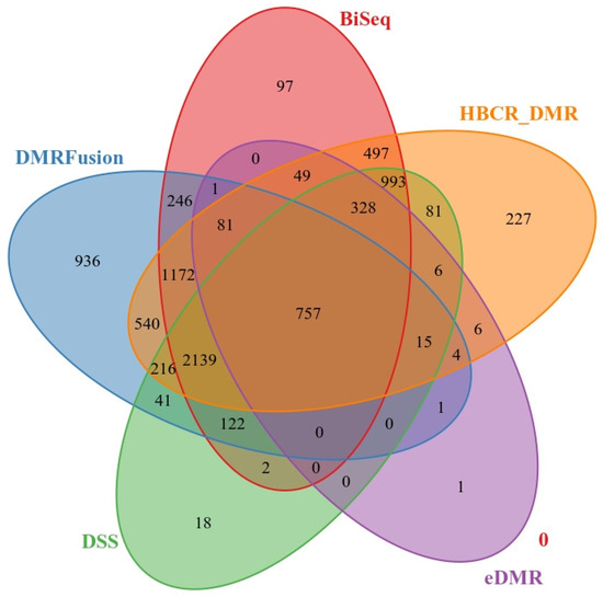 Overlap of TP DMRs for Methylkit/eDMR, BiSeq, DSS, DMRFusion, and HBCR_DMR methods.