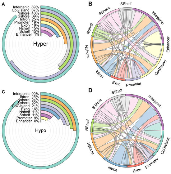 Figure 4A,C reveal that the majority of identified DMRs in both the hypermethylation and hypomethylation categories are predominantly situated within intergenic regions, accounting for 89% and 90%, respectively. In the case of hyper DMRs, 67% of them are annotated within CpG islands, whereas only 21% of the hypomethylated DMRs are found in these regions. Notably, a significant portion of hyper DMRs is located in CGI shores, followed by exons, promoters, and CGI shelves, in that order.