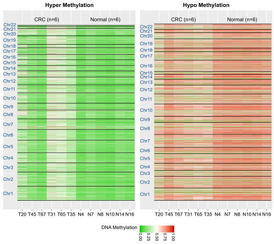 We assessed DNA methylation changes based on DMRs among six CRC samples (T20, T45, T67, T31, T65, T35) and six control samples (N4, N7, N8, N10, N14, N16). In Figure 5, the hyper- and hypomethylation DMR regions are depicted in a heatmap at an FDR of 0.01. A distinct pattern of DNA methylation changes is evident between the CRC and control samples.