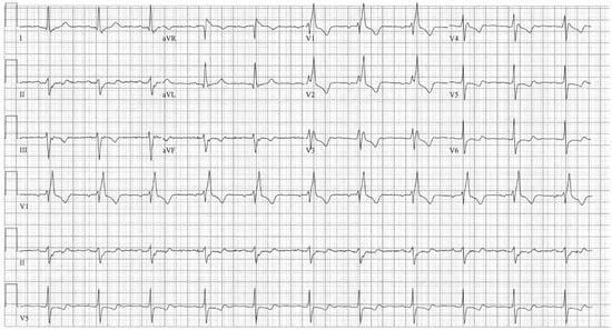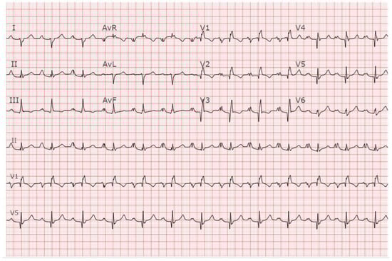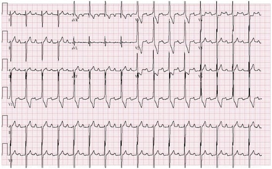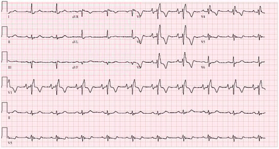 Tetralogy of Fallot (ToF) is a cyanotic congenital heart disease that represents almost 10% of congenital heart diseases. It consists of anterocephalad deviation of the outlet septum, narrowing of the pulmonary tract, large outflow tract ventricular septal defect, aorta overriding the interventricular septum, and concentric hypertrophy of the right ventricle []. Surgical repair has become routine practice in pediatric heart surgical centers and, as a result, there is a sizeable population of adults with repaired ToF. Although surgical repair enlarges the pulmonary outflow tract, ameliorates pulmonary valve stenosis, and patches the ventricular septal defect, residual pulmonary regurgitation and/or stenosis can worsen. Although these residual lesions are tolerated for a long time, right ventricular remodeling and associated arrhythmias, exercise limitation, heart failure and even death can result. The EKG of adult patients with ToF after surgical repair reflect this progressive right ventricular dilatation and dysfunction []. With increasing age, the right atrium increases in size and atrial arrhythmias follow. The PR interval can increase and, due to the ventricular septal defect closure, complete atrioventricular block may occur. The QRS almost always demonstrates right bundle branch block. The main risk factor for ventricular arrhythmias in adults with repaired ToF is QRS prolongation, particularly when the QRS duration is ≥180 ms []. Non-sustained ventricular tachycardia can result and must be sought when patients have such QRS prolongation or symptoms of palpitations or syncope. Pulmonary valve replacement to correct the pulmonary regurgitation can be beneficial. Additional risk factors of ventricular arrhythmias in ToF include QRS dispersion, an increase in QRS duration per year, QT duration and QT dispersion. Electrophysiologic studies have identified macro-reentry as the major mechanism for induced and spontaneous anatomic isthmuses related to VT. Moreover, these anatomic isthmuses are bordered by patch material, valve annuli, and surgical incisions []. Figure 8 demonstrates the EKG of a patient with repaired tOF.