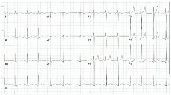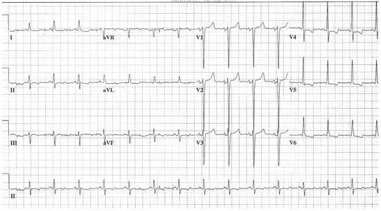 HOCM is a type of hypertrophic cardiomyopathy (HCM) that is characterized by proximal thickening of the ventricular septum of at least 15 mm that is not a result of abnormal loading conditions. This septal thickening narrows the left ventricular outflow tract and results in a gradient of at least 30 mmHg. Usual symptoms include dyspnea, chest pain, palpitations and post-exertional syncope []. Physical examination is heralded by a systolic murmur that increases with Valsalva strain, decreases with squatting and roars when standing from squatting. The diagnosis is confirmed by imaging. The EKG in HOCM may have abnormal Q waves, simulating myocardial infarction with deeper than normal Q waves in lateral and inferior leads []. Although Q waves can be present in both obstructive and nonobstructive forms of HCM, a cardiac magnetic resonance study revealed that abnormal Q waves were associated with greater upper anterior septal thickness []. A convolutional neural network trained and validated using a digital 12-lead EKG from patients with a verified HCM diagnosis, and non-HCM age- and sex-matched control subjects, was able to differentiate HCM from normal with high diagnostic performance []. EKG voltage criteria for left ventricular hypertrophy are nearly always present in patients with HCM [] (Figure 10).