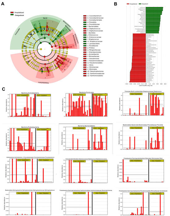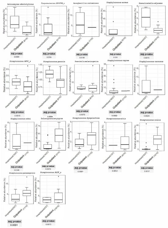 - Bellato, M.; Cappellato, M.; Longhin, F.; Del Vecchio, C.; Brancaccio, G.; Cattelan, A.M.; Brun, P.; Salaris, C.; Castagliuolo, I.; Di Camillo, B. Uncover a microbiota signature of upper respiratory tract in patients with SARS-CoV-2+. Sci. Rep. 2023, 13, 16867. [Google Scholar] [CrossRef]