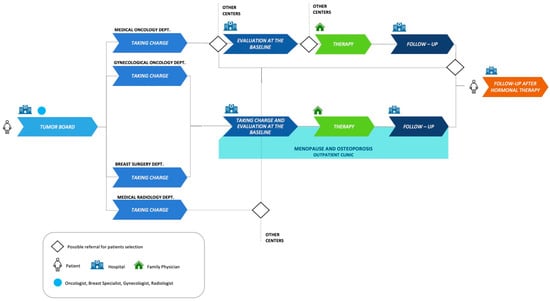 In this scenario, we conducted an organizational analysis to understand how specialists involved in the care of post-surgical BC patients (prescribed with AI treatment) manage their risk of bone loss, define the workflow status, and eventually, increase its quality by redesigning the model. The new clinical pathway is part of the study “HEQUOBIP—health and quality of life in Oncological patients: management of bone pathology in the Italian cancer treatment-induced bone loss (CTBL) population” (PROT 5147/18 ID 18—Clinicaltrial.gov: NCT04055805) and received the approval as a standard clinical pathway (PCA—Pathway of Clinical Assistance) for breast cancer on 16 June 2022.