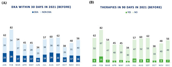 In 2021, n. 643 patients with a new diagnosis of BC were discussed in our multidisciplinary tumor board reviews, 34% (n. 222/643 patients) of whom underwent DXA evaluation within 30 days (Figure 2A). Only 14% (n. 93/643 patients) were prescribed antiresorptive therapies within 90 days (Figure 2B).