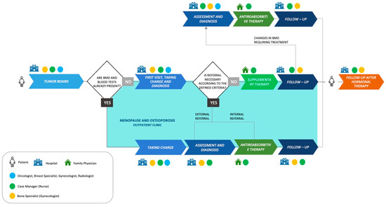 In our previous model (Figure 1), post-surgery BC patients were discussed by a multidisciplinary tumor board, and those with hormone-receptor-positive tumors received indications to start adjuvant endocrine therapy. These patients continued their clinical course in one or more medical departments (Medical Oncology, Gynecological Oncology, Breast Pathology, and Medical Radiology). Some of them were referred to our outpatient clinic specialized in menopause and osteoporosis for a basal evaluation of bone status, including Dual-Energy X-ray Absorptiometry (DXA) of the lumbar spine and the hip and a panel of bone metabolism blood tests, followed by the prescription of antiresorptive treatment, if appropriate.