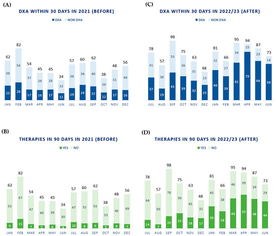 In complex healthcare scenarios, the standardization of procedures and practices is not always feasible for several reasons, including patient flows (in terms of volumes of activities), human resources, organizational mission and vision, clinical assets, and expertise [34]. However, our experience could be useful, allowing us to acknowledge some aspects that can facilitate patient management in large-volume hospitals, with the specific goal of preventing bone loss in BC patients. In fact, the preliminary results shown in Figure 4C,D seem to be promising for our goal of substantially increasing the frequency of DXA assessments within 30 days and ensuring therapy is prescribed within 90 days after AI treatment prescription.