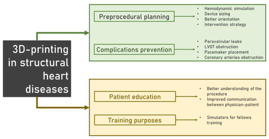 Three-dimensional (3D) printing remains the cornerstone of personalized medicine in surgery [6,7]. It is a digital-to-physical fabrication technique that has seen rapid integration into cardiovascular surgery. It enhances visualization of anatomical details and facilitates precision procedures. In the field of cardiovascular surgery, 3D printing has been explored for preparing well-tolerated treatments and offers substantial insights into the accuracy of surgical reconstruction in intricate cardiovascular anatomy. The technology’s utility extends to guiding both surgical and transcatheter procedures, thus contributing to improved outcomes and individualized patient care. This synthesis highlights the transformative impact of 3D printing on clinical scenarios, emphasizing its crucial role in advancing cardiac care. The applications of 3D printing expand on the assessment of procedural feasibility, device selection, prediction of outcomes, and post-procedural follow-up [8,9,10]. More specifically, in the current literature, 3D printing is utilized primarily in the preoperative planning of valvular disease and left atrial appendage closure. Apart from that, its implementation may be beneficial for educational purposes and device evaluation experiments [6,11] (Figure 1).