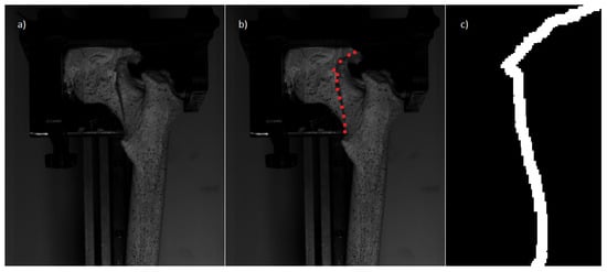 Fracture patterns can be represented with 2D images. These are the easiest and simplest representations. They are also the most inaccurate. Use of 2D images is one of the most widely used representations in the previous literature on geometric fracturing [52,53,54,55]. In bone fracturing, this representation does not require the use of CT images to obtain the fracture pattern; it requires an analysis of the fracture zone of real bone specimens, utilizing a variety of imaging modalities, including X-rays, photographs, and sequential images where the exact moment at which the fracture occurs is identified. In order to obtain these, an analysis of the fracture zone of the real bone is performed. Therefore, it is necessary to monitor the exact moment when a fracture occurs. This is because the displacement can cause small pieces to break off, altering the original position at which the fracture occurred. The capture and analysis of the fracture lines in a posterior way may result in the bone arrangement not being exactly the same in all cases of study. Figure 1 shows an overview of the process to be followed to obtain the fracture pattern. To obtain the fracture lines, the frame where the fracture occurs is identified (Figure 1a) and the entire area is marked manually (Figure 1b,c).
