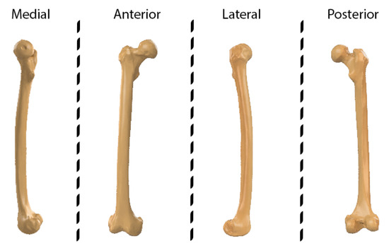The shape of bones presents a great challenge given the roughness and anatomical features. Each human bone is unique and has geometry and dimensions that are different from the bones in other specimens [3,4]. Factors such as nutrition, age, and lifestyle influence the shape and size of the bones; thus, it is important to use advanced methodologies in order to analyze the characteristics of each fracture [5]. Despite this, they share a similar structure and weaknesses in the same regions of the bone. Therefore, the main classifications of bone fractures are based on the region in which they occur and the number of fragments generated rather than the exact shape of the fractures [6,7]. Moreover, Perez et al. [8] recently studied the repeatability of a fracture pattern in human femurs within a controlled environment and concluded that, although the characteristics are unique, they share fragility in the same areas and the conditions can be reproduced to simulate the same type of fracture.