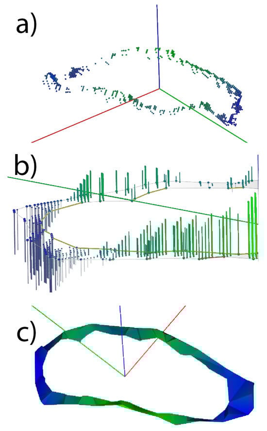 There are several methods to represent the fracture pattern obtained such as the point cloud itself, height maps, or triangle meshes. The representation of a fracture zone by a point cloud or its variants offers substantial utility in the detailed characterization of fractures in materials. In Figure 4a, we have the points in their original position with the associated color; meanwhile, in Figure 4b, they are projected on a 2D plane, including the border that delimits the fracture zone and a projection of the points on the plane representing the distance to it. These points can be processed by a 2D alpha shape algorithm that returns the cortical surface of the pattern (Figure 4c). The points are in a range of colors from blue to green, in which blue indicates the points farthest from the fitting plane while green indicates the points closest to the fitting plane.