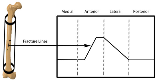 Spherical coordinate systems are based on the same idea as polar coordinates and allow us to represent a position in space. These coordinates represent positions in space in problems that unfold over a cylindrical shape. For this representation, three coordinates are used, with one of them being the angle with the X axis of the cylinder and the remaining two being distances. The use of spherical coordinates to present a fracture pattern can be simplified by projecting them onto a 2D plane, resulting in a two-dimensional pattern with 3D fracture information. This process involves mapping each point on the bone surface to its corresponding coordinates in a spherical coordinate system, where the radial distance, polar angle, and azimuthal angle uniquely define each point. Subsequently, these spherical coordinates are transformed into Cartesian coordinates, allowing for the projection of the fracture pattern onto a 2D plane. By unfolding the fracture zone in this manner, the resulting representation provides a detailed and comprehensive view of the fracture characteristics, facilitating in-depth analysis and classification of fracture patterns for various medical applications. Figure 6 shows an example of the projection in a plane. Several authors used this representation to analyze bone fracture patterns, subdividing the spatial plane in which the fracture is projected into four parts [56,57,58,59]. Each part corresponds to a view or aspect of the bone (anterior, lateral, posterior, medial).
