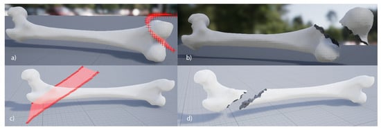 Four alternatives have been found to represent a bone fracture pattern in the previous literature: textures, point clouds, spherical coordinates, and contour plots. Each representation shown above is usually used for a specific purpose; the different variants of point clouds are the most commonly used. The texture-based representation is the simplest and easiest to obtain. It is well-suited for educational purposes and introductory training simulations where simplicity and ease of understanding are paramount. They offer a straightforward visualization of fracture patterns and can be useful for providing basic insights into fracture mechanics. Additionally, they may find application in early-stage fracture diagnosis systems where rapid assessment is needed. Works such as those developed by Müller et al. [61] or Pérez-Cano et al. [55] used this representation. In both studies, they used this representation to combine realistic-looking fracturing with physics-based fracturing. Pérez-Cano et al. [55] applied the texture on the bone model and projected onto one of the aspects of the bone, obtaining the cut-out area (Figure 7a,c). After that, they established a relationship between the different fragments composing the bone fracture and a series of mechanical properties to generate a prefractured model and simulate the detachment of the fragments by applying forces.
