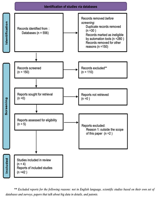 The number of records initially identified via database searching was 556 studies. Next, the articles with related titles or relevant abstracts were inspected and held for further analysis. For inclusion, the selected papers are either scholarly journals or studies, and the content is related to the review questions. After excluding the duplicates, the articles were further screened to exclude articles that did not accentuate the topic of big data in precision medicine. As a result, 150 studies were identified from the used databases.