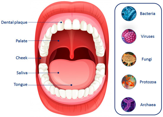 The oral cavity contains the second largest microbiota in the human body, second only to the intestinal one [84]. Specifically, oral microbiota is characterized by a wide spectrum of microorganisms, including bacteria, fungi, archaea, viruses, and protozoa (Figure 1), each of which has a critical role in maintaining the host’s health status [85].