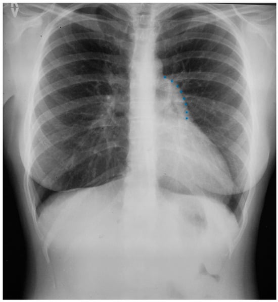 Posteroanterior chest X-ray in congenital complete absence of the left portion of the parietal pericardium: A 30-year-old female was referred to a cardiologist because of an unusual chest X-ray done as part of an executive physical. She was asymptomatic and her vital signs and heart sounds were normal and there was no heart murmur or arrhythmia. The image is well centered, there is a good inspiration and the C-T ratio is <0.5. The heart is shifted into the left chest and the right heart border is obscured because it overlies the dorsal vertebral bodies. The pulmonary artery segment (outlined with blue dots) is enlarged but the pulmonary vascularity is normal, making left to right shunting unlikely. Echocardiography and Cardiac MRI confirmed she had CCALPPP. She was reassured. No treatment was necessary.