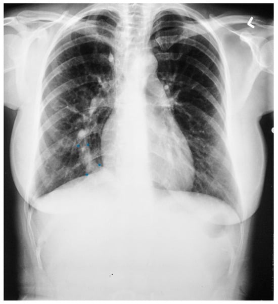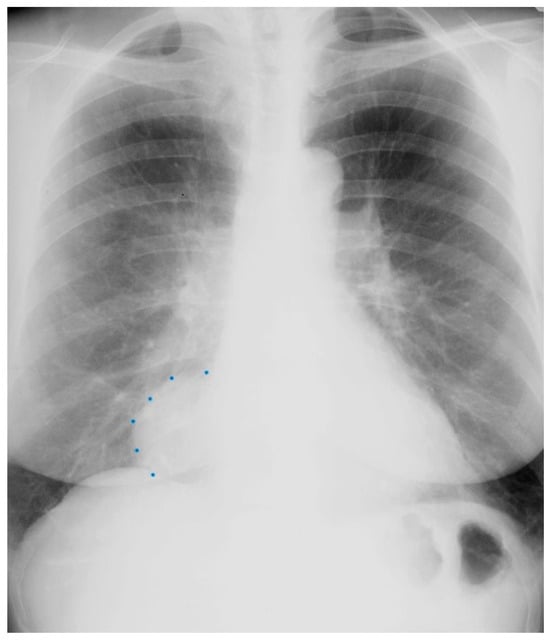 Posteroanterior chest X-ray of Pericardial Cyst: This is a chest X-ray of a 40-year-old female with a pericardial cyst. The film is well centered and there is a good inspiration. The cardiothoracic ratio is normal. Just above the aortic knob the manubrium sterni is well focused. It is shaped like a trapezoid and articulates with the clavicular heads. The lungs and pulmonary vascularity appear to be normal. There is a mass at the right cardiophrenic angle that obscures the lower right-heart border. This heart border obscuration is called the silhouette sign and is present because the mass is anterior in the chest and adjacent to the heart. This mass is a pericardial cyst (blue dots). The pericardial cyst is slightly more radiolucent than the heart because it is a thin-walled structure that is filled with pericardial fluid. A pericardial cyst is also known as a spring water cyst. As she was asymptomatic and there was no physical examination evidence of cardiovascular compromise, she received no treatment and was periodically observed.