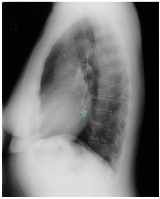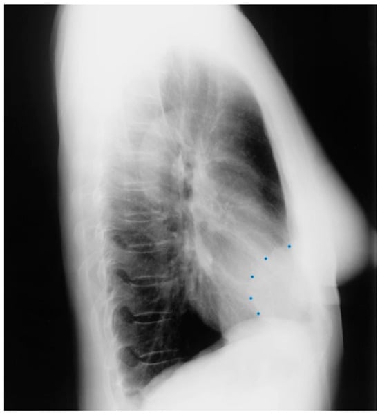 Lateral chest X-ray of a pericardial cyst: This is the lateral chest X-ray of the same-40 year-old female with a right cardiophrenic angle pericardial cyst. This image demonstrates that this pericardial cyst (blue dots) is located anteriorly in the chest and adjacent to the heart, and explains the silhouette sign on the posteroanterior chest X-ray. In this image, because the cyst and the heart are superimposed, their radiodensities are summed and the cyst appears denser than the rest of the heart that it does not overlie.