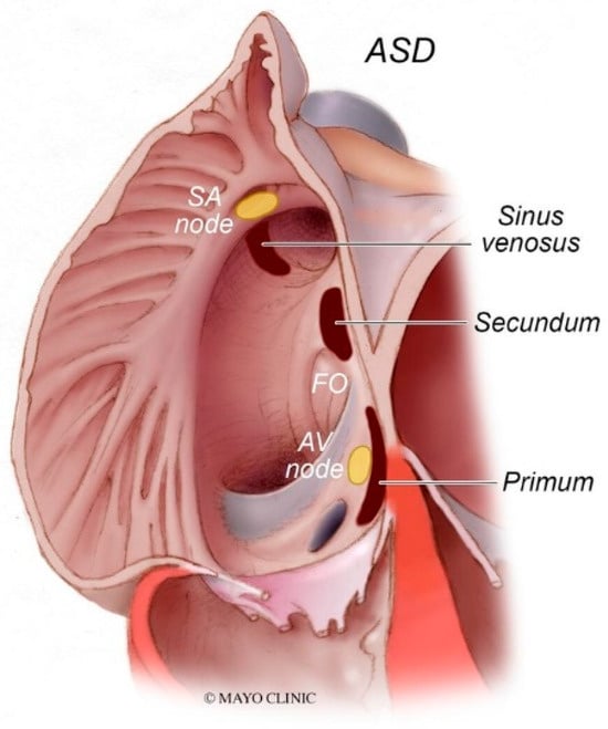Types of atrial septal defects: Sinus venosus atrial septal defect is typically in the superior and posterior aspect of the inter-atrial septum and is commonly associated with partial anomalous pulmonary venous return. Secundum atrial septal defects, which are the most common type of atrial septal defects, occur in the middle of the inter-atrial septum. Primum atrial septal defects occur in the inferior aspect of the inter-atrial septal and are commonly associated with cleft atrio-ventricular valves. AV node: atrioventricular node; FO: fossa ovalis; SA node: sinoatrial node.