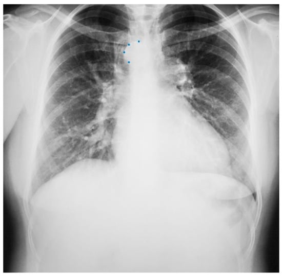 Persistent Left Superior Vena Cava (PLSVC) is a congenital anomaly that results from failure of closure of the left anterior cardinal vein. In these patients, both right and left brachiocephalic veins drain into the PLSVC [14]. The PLSVC drains into the right atrium via the coronary sinus. PLSVC is the most common thoracic venous anomaly [15]. It is often diagnosed as an incidental finding when a CXR is done after the placement of a central venous catheter or pulmonary artery catheter. It can be suspected when the coronary sinus is found to be enlarged by echocardiography. When a dilated coronary sinus is noted, and PLSVC is suspected, injection of agitated saline individually into the right and the left antecubital veins is performed while imaging the heart with a somewhat posteriorly-angled apical four-chamber image. If there is a PLSVC, the enlarged coronary sinus is opacified first, followed by the right atrium. If the PLSVC is not associated with other congenital cardiac anomalies, it is usually asymptomatic and hemodynamically insignificant. An absent right superior vena cava can pose management difficulties during various cardiovascular procedures that involve accessing the heart via the superior vena cava, such as placement of a pacemaker wire, bicaval cannulation for cardiopulmonary bypass or venous cannulation for extracorporeal membrane oxygenation, among others. Figure 16 and Figure 17 represent CXRs of persistent left superior vena cava.