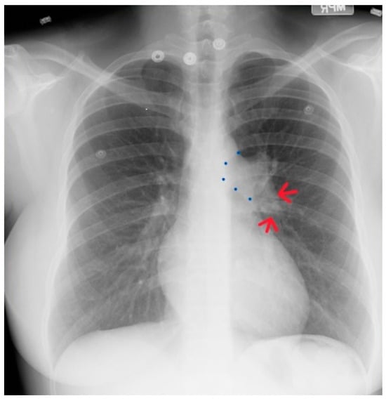 Posteroanterior chest X-ray of severe pulmonary stenosis: this chest X-ray is of a 31-year-old female who presented with worsening exertional dyspnea over the last two years. Her exam revealed elevated jugular venous pressure with prominent A wave. She was noted to have a right ventricular lift with a grade 4/6 systolic ejection murmur best heard at the left upper sternal border. The chest X-ray is well centered and there is a good inspiration. The cardiothoracic ratio is normal. The pulmonary trunk is enlarged (its right border is outlined by blue dots as it passes over the left bronchus). The left pulmonary artery branch that is indicated by two red arrows is also enlarged. Her echocardiogram revealed severe pulmonary valve stenosis with peak gradient 68 mmHg and mild pulmonary valve regurgitation. She subsequently underwent balloon valvuloplasty with reduction of her peak gradient to 24 mmHg. Her symptoms of dyspnea had resolved a few months post-procedure.