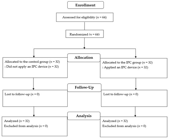 This prospective randomized trial, registered at cris.nih.go.kr (KCT0007095), was approved by the Institutional Review Board (IRB) of Gachon University Gil Hospital (approval no: GBIRB2022-023). Before starting the trial, all the participants provided informed consent. A total of 64 patients with obesity aged 19–65 years with an American Society of Anesthesiologists (ASA) physical status of 2 (body mass index; BMI > 30 kg/m2) scheduled for laparoscopic sleeve gastrectomy were included. Patients with a history of autonomic nervous system dysfunction; cerebrovascular disease; uncontrolled cardiovascular disease, including hypertension; uncontrolled endocrine disorders, including diabetes mellitus; peripheral vascular disease; and uncontrolled respiratory disease were excluded. The participants were randomly assigned to a group that received the IPC device (IPC group, n = 32) and a group that did not (control group, n = 32) using a randomization process conducted in Excel 2013 (Microsoft Office, Redmond, WA, USA). The IPC device (Kendal SCDTM 700 series, Covidien, MA, USA) was used in the IPC group after anesthesia induction. The postoperative outcome assistant and patients were blinded to the group assignment; only the anesthesiologists conducting the study were aware of the group assignment.
