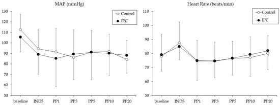 The incidence of intraoperative hypotension requiring vasopressors such as ephedrine or phenylephrine was not significantly different between the control and IPC groups (15 patients (47%) vs. 10 patients (31%), p = 0.153). The changes in MAP and HR are illustrated in Figure 2. Changes in MAP and HR over time were similar between the control and IPC groups (p = 0.196 and p = 0.705, respectively). There were no intergroup differences in the MAP or HR at any study time point.