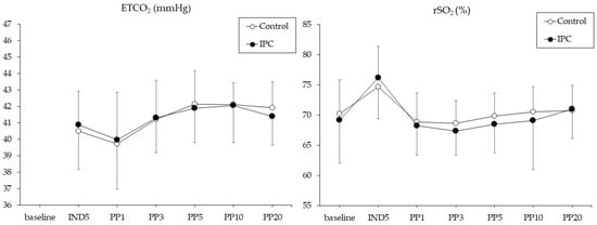 The incidence of intraoperative cerebral desaturation was not significantly different between the control and IPC groups (one patient (3%) vs. two patients (6%), p = 0.488). None of the patients experienced an absolute rSO2 value of <50% or postoperative cognitive dysfunction. The changes in rSO2 and ETCO2 are illustrated in Figure 3. Changes in rSO2 and ETCO2 over time were similar between the control and IPC groups (p = 0.190 and p = 0.756, respectively). There were no intergroup differences in rSO2 or ETCO2 at any time point. In both the control and IPC groups, rSO2 increased significantly at IND5 (p = 0.003 and p < 0.001, respectively) compared to the baseline values, whereas it decreased significantly at PP1, 3, 5, 10, and 20 (all p < 0.05) compared to IND5.