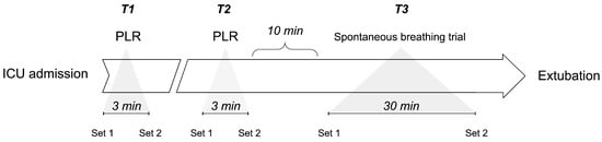 T1 corresponds to the first PLR maneuver, T2 corresponds to the second one (before the spontaneous breathing trial), and T3 corresponds to the 30 min period between the start and conclusion of the SBT. The set of hemodynamic parameters recorded for comparative analyses included the CI, SVI, SVV, CVP, and TFC (see main text for details).