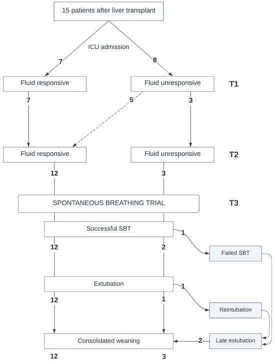 Flowchart describing the ventilatory outcomes of fifteen liver transplant patients after ICU admission, based on their fluid responsiveness and progression through a spontaneous breathing trial. Consolidated weaning was defined as no reintubation up to day 7 after extubation (n = number of patients).