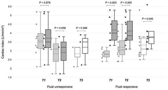Cardiac index variations across different time points in fluid-responsive and fluid-unresponsive post-surgical liver transplant mechanically ventilated patients. T1: PLR maneuver upon ICU entry, T2: PLR before spontaneous breathing trial, T3: 30 min period between the start and conclusion of the spontaneous breathing trial.