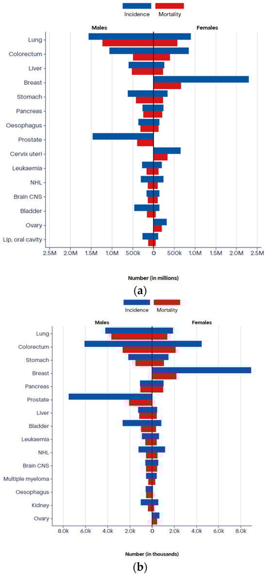 Incidence and mortality of the top 15 cancer sites in males and females (a) worldwide (b) and in Portugal. Available online: https://gco.iarc.fr/ (accessed on 16 April 2024).