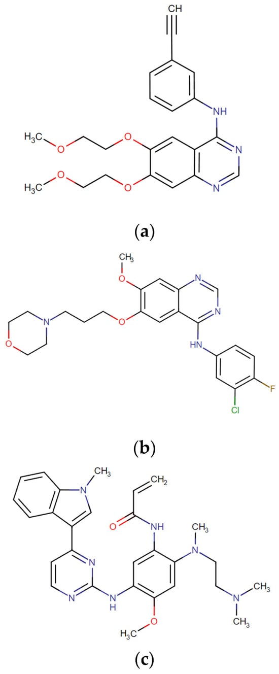 Chemical structures of (a) erlotinib; (b) gefitinib; and (c) osimertinib. Available online: https://go.drugbank.com/ (accessed on 23 February 2024).