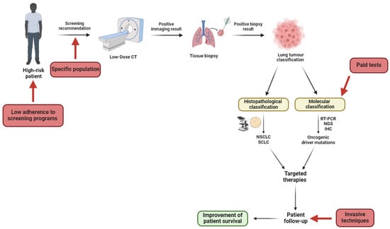 Ideally, the journey of a lung cancer patient should follow all the previously recommended steps for early diagnosis and a personalized treatment, improving survival. Additionally, although there is no consensus on how long the assessment of a patient with suspected lung cancer should take, this should be as quick as possible. Guidelines from the College of American Pathologists, the International Association for the Study of Lung Cancer, and the Association for Molecular Pathology suggest that the turnaround time between the biopsy and the reporting of results should be about 10 days [84]. In agreement with this, the ASCO guidelines recommend a response time of less than 14 days [85].