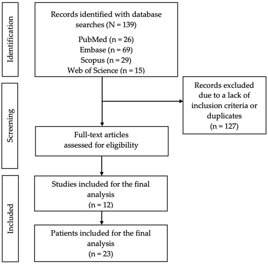 In February 2024, a search for anti-SRP myopathy cases treated with PE returned 139 articles, of which 127 were excluded. Of the remaining 12 articles, clinical data were extracted for 23 patients who met the inclusion criteria (Figure 1) [15,16,17,18,19,20,21,22,23,24,25,26].