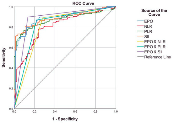 We found that an EPO value of <4.85 could significantly predict PV, with 79.41% sensitivity and 87.80% specificity [AUC = 0.886 (0.841–0.931), p < 0.001]. The inflammation indices also demonstrated considerable diagnostic accuracy, which is detailed in Table 2. Notably, an SII value of ≥803 demonstrated 80.69% sensitivity and 89.29% specificity [AUC = 0.885 (0.841–0.929), p < 0.001]. The combined variables also showed high overall accuracy similar to EPO; however, the Hanley and McNeil analysis showed that the NLR and the EPO and NLR combination had significantly worse classification capabilities compared to EPO alone. It is crucial to note that, despite having a similar AUC value to EPO, the EPO and SII combination yielded improved diagnostic potential, with 88.53% accuracy, 89.71% sensitivity and 86.59% specificity [AUC = 0.881 (0.829–0.933), p < 0.001] (Table 2, Figure 1).