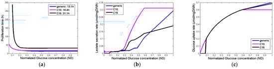 Figure 4 summarizes the output variables for different glucose concentrations and different phenotypes. Although the glucose uptake rates (Figure 4c) are very similar among the different phenotypes, their proliferation time (Figure 4a), as well as the lactate production (Figure 4b), are substantially different for the different concentrations of glucose.